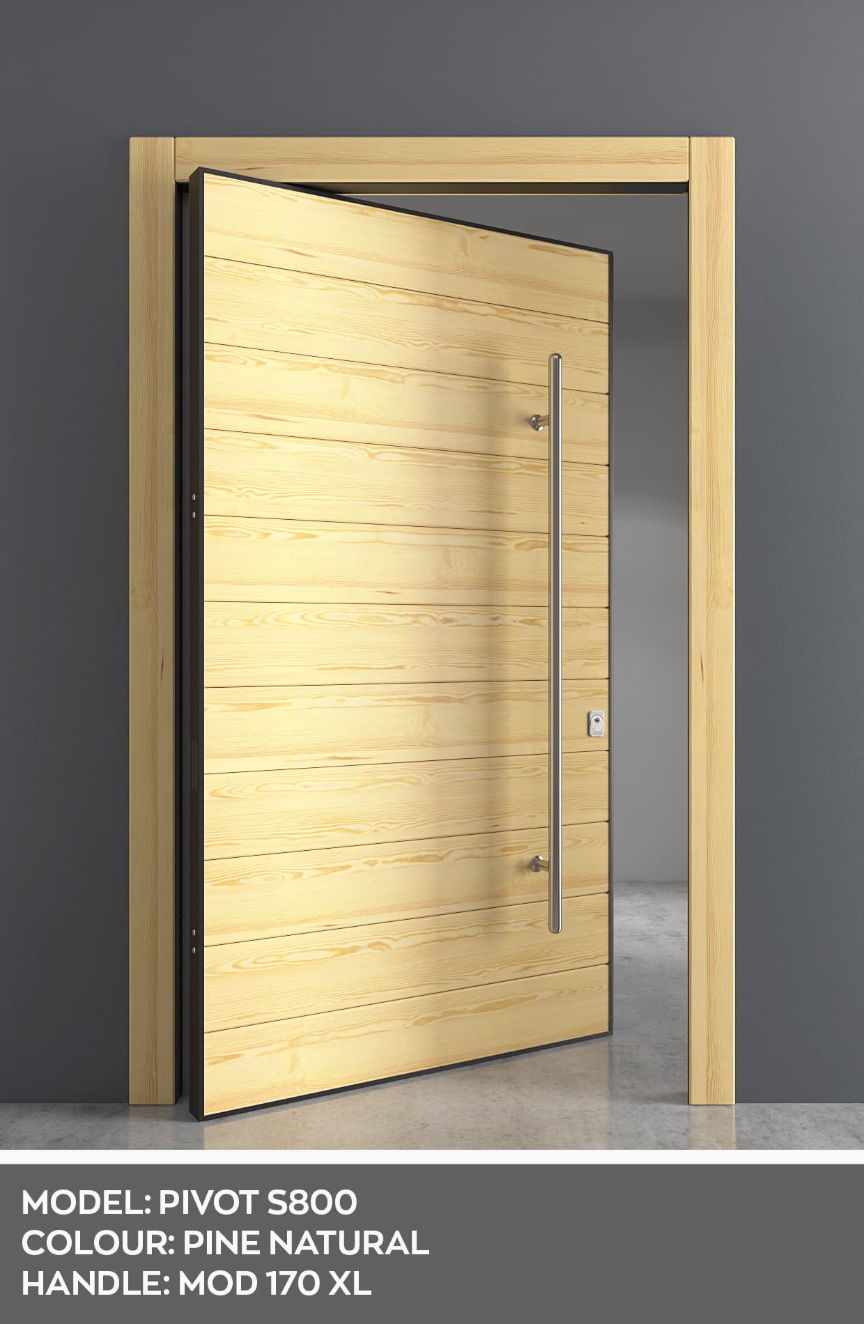 Η αξονική πόρτα Pivot προσφέρει εξαιρετικές δυνατότητες εφαρμογής. Μπορεί να καλύψει μεγάλα ανοίγματα και να δημιουργήσει ένα ιδιαίτερα εντυπωσιακό αποτέλεσμα χάρη στην περιστροφή της γύρω από τον άξονα. Δίνει ελευθερία στον αρχιτεκτονικό σχεδιασμό καθώς η πόρτα παύει πλέον να έχει την έννοια ενός τυπικού ανοίγματος και αποκτά την ισχύ ενός σημαντικού αρχιτεκτονικού στοιχείου στο χώρο. Είναι σχεδιασμένη ώστε να ακολουθεί τις τάσεις του σύγχρονου design προσφέροντας απόλυτη ευθεία μεταξύ του τοίχου και της πόρτας. Η περιστροφή της γύρω από τον άξονα επιτρέπει τη λειτουργία της σε μεγάλα ανοίγματα που μπορεί να φτάσουν και τα 2 μέτρα σε πλάτος. Ο μεντεσές της αξονικής πόρτας Pivot, κατασκευασμένος με ειδικά ρουλεμάν που βρίσκονται στο πάνω και κάτω μέρος του άξονα, διατηρεί σταθερό τον άξονα και αφήνει την πόρτα να περιστρέφεται γύρω από αυτόν, εξασφαλίζοντας έτσι μεγάλη διάρκεια ζωής χωρίς φθορές.
